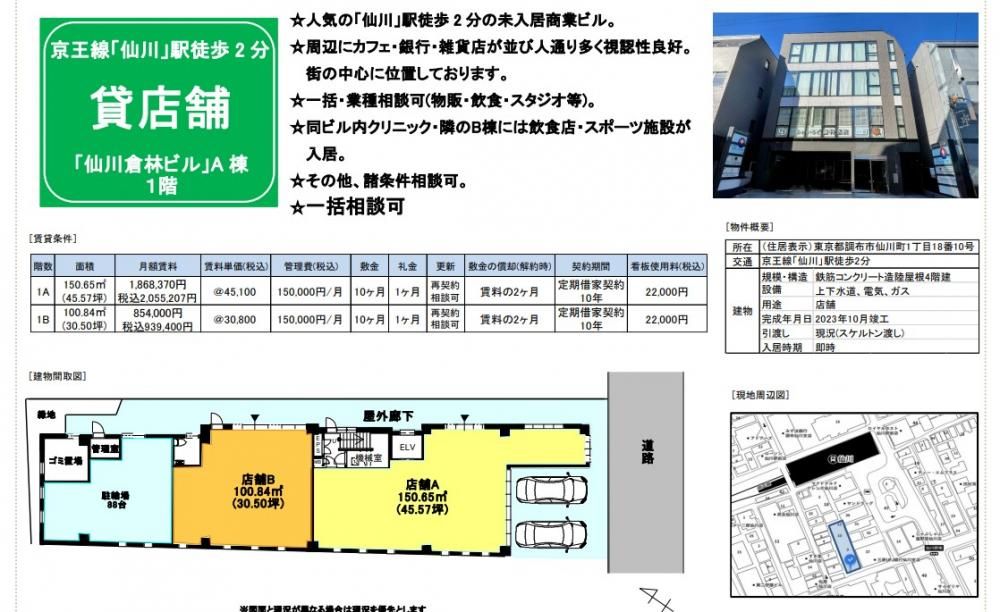 【スタッフからのイチオシポイント】仙川倉林ビルA棟【仙川駅徒歩2分☆ハーモニーロード☆商店街☆】1階路面店!飲食店可能!カフェや物販・スタジオ等に!2023年10月新築!10年契約☆スケルトン渡し!動力・都市ガス有!再契約可能☆