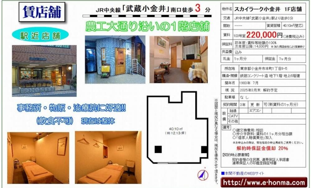 【スタッフからのイチオシポイント】スカイラーク小金井【武蔵小金井徒歩3分☆1階店舗!】農工大通り沿い☆事務所・物販・治療院などにオススメ!前テナントは整体院になります!業種ご相談下さい♪
