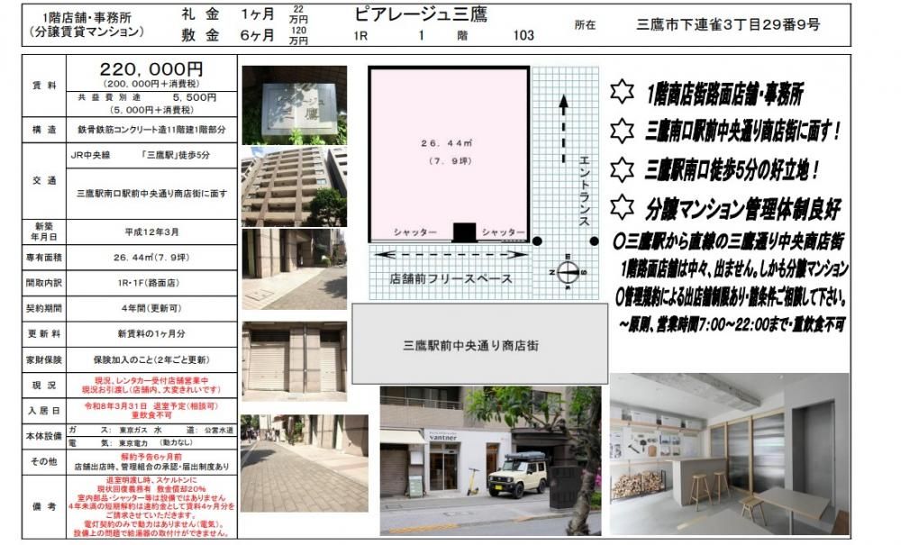 【スタッフからのイチオシポイント】ピアレージュ三鷹【分譲マンションの1階路面店で飲食店可能!】現在健康・レンタカー受付店舗が営業中!2026年3月末退去予定です!営業時間は朝7時から22時となります。設備上の問題で給湯器の取り付けが不可となります。店舗前フリースペース有!管理体制良好です☆
