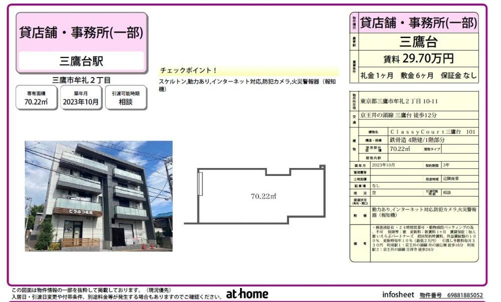【スタッフからのイチオシポイント】Classy Court三鷹台 【旭化成施工の築後未入居物件☆1階角地☆】室内はフルスケルトンになります!新築なので室内綺麗です!旭化成施工!業種相談下さい♪隣の区画はどうぶつ病院になります。火災報知器あり♪