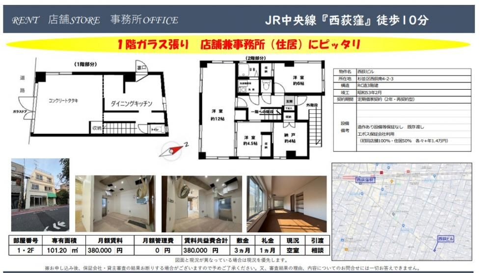 【スタッフからのイチオシポイント】西荻ビル【1階ガラス張りの店舗☆2階は住居仕様になってます!】西荻窪駅徒歩10分!RC造になります☆2階に上がる外階段もあり!店舗兼事務所(住居)にオススメです♪物販店やサービス店舗に!業種相談下さい!