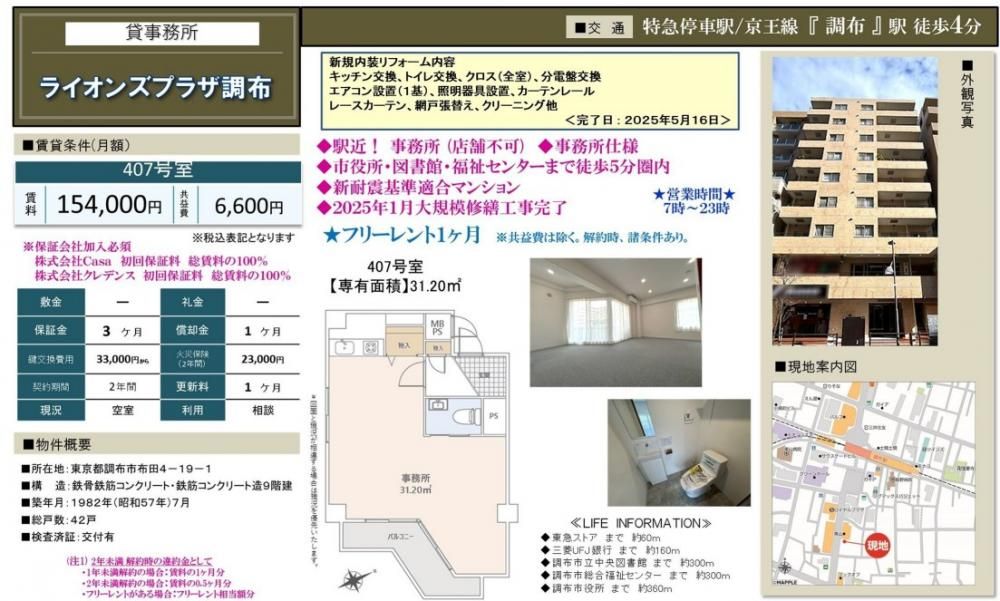 【スタッフからのイチオシポイント】ライオンズプラザ調布【家賃1カ月フリーレント!事務所専用!(店舗利用不可)】新規内装リフォーム済み!キッチン交換・トイレ交換・クロス・分電盤交換・エアコン・照明器具・カーテンレール・網戸張替え!(完了2025年5月)賃料ダウンしました!礼金無し!