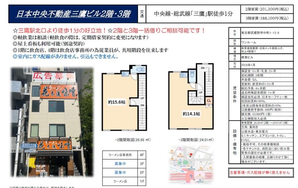 【スタッフからのイチオシポイント】日本中央不動産三鷹ビル【三鷹駅北口徒歩1分☆2階・3階同時募集☆】飲食店は不可となります。現在は2階が景品交換所、3階は事務所が入ってます。エレベーター無し。屋上看板も利用可能です(別途料金)トイレあり!各種サロンや事務所にも!ガスが引き込み不可の為使えません!