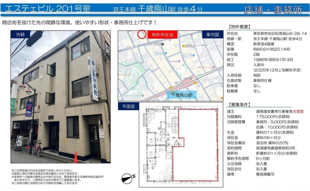 【スタッフからのイチオシポイント】エステェビル【千歳烏山駅徒歩4分☆2階部分になります!】66.6u(約20.14坪)室内事務所仕様!2025年12月上旬空予定!管理費は事務所の場合は5000円になります。