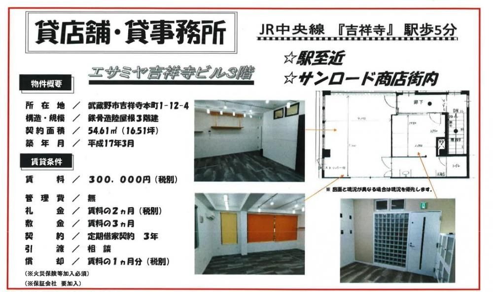 【スタッフからのイチオシポイント】エサミヤ吉祥寺ビル【吉祥寺駅北口☆サンロード商店街内!3階部分!】前テナントは不動産会社になります。54.61u(約16.51坪)になります♪再契約相談可能!エレベーターはありません。トイレ・洗面台あり!