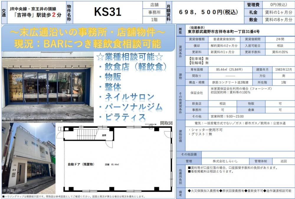 KS-31 1F 吉祥寺の賃貸店舗(建物一部)